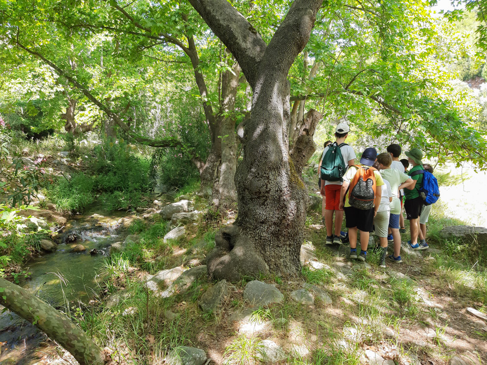 - Ξεναγούμαστε στον Μεσαιωνικό τριώροφο Πύργο της Οινόης, και διασχίζουμε το μονοπάτι του φαραγγιού φτάνοντας στην κοίτη του ποταμού Χαράδρα. Σε μικρές ομάδες εξερευνούμε το ποτάμι, περνώντας ανάμεσα από πλατάνια και καλάμια, παρατηρώντας την υδρόβια ζωή.